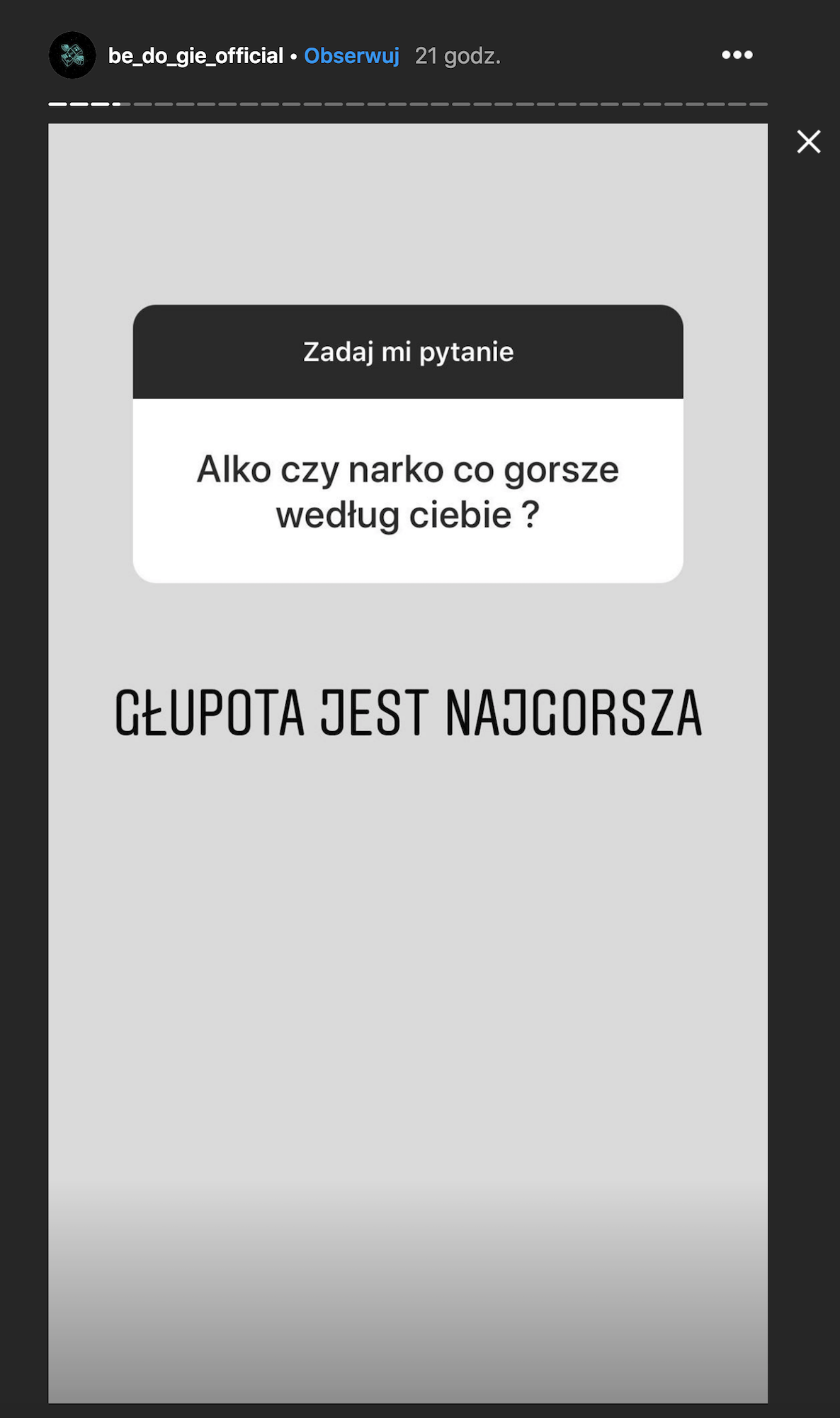 – Szczerze wariat, to rozjebałeś mnie – pieje na głos i nie mogę się ogarnąć. Ale myślę, że życie będzie podsyłać próby charakteru o myślę w odpowiedzi na twoje pytanie – nie zadawać się z gamoniami, bo kto z kim przystaje, takim się staje.