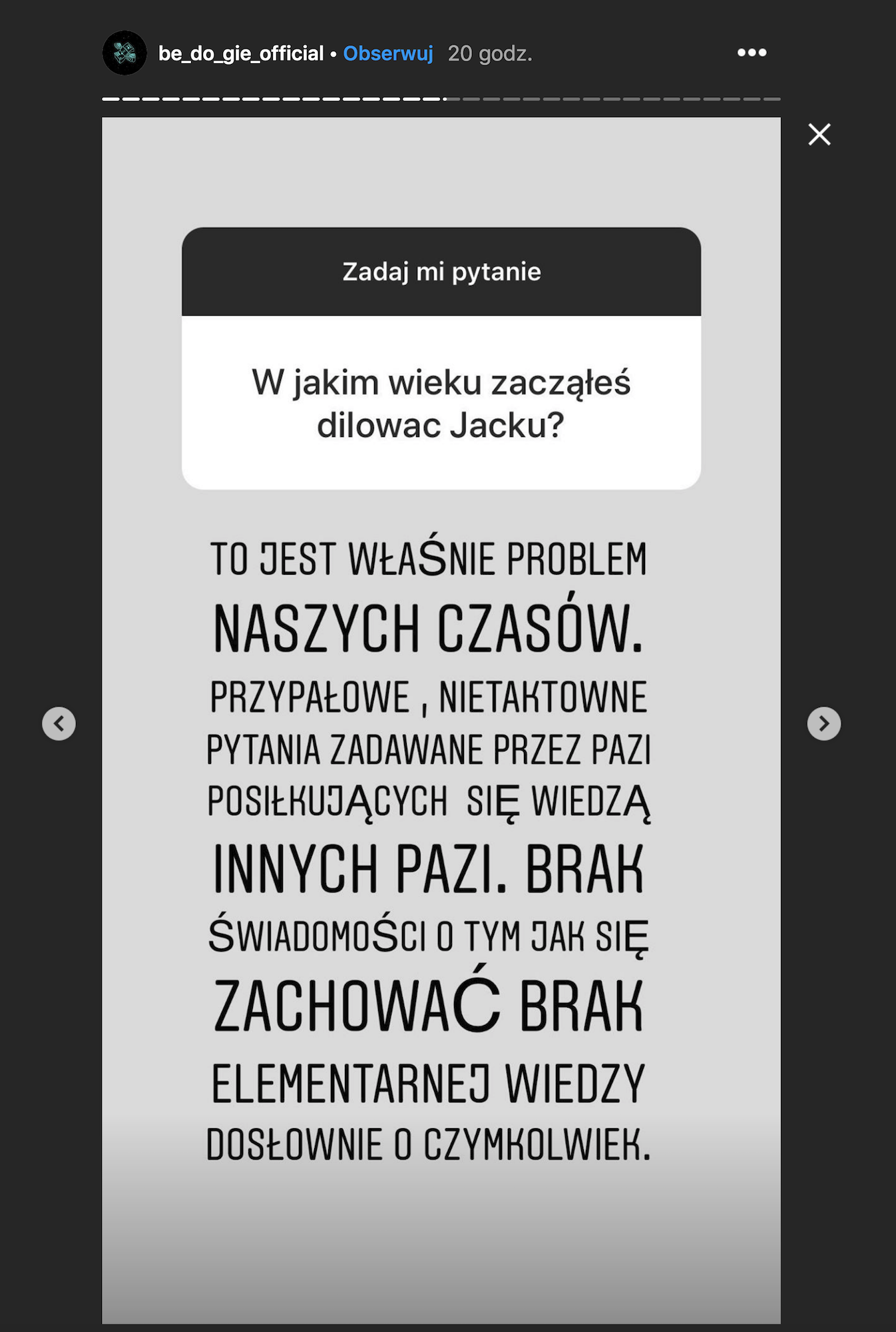 – To jest właśnie problem naszych czasów. Przypałowe, nietaktowne pytania zadawane przez pazi posiłkujących się wiedzą innych pazi. Brak świadomości o tym, jak się zachować. Brak elementarnej wiedzy dosłownie o czymkolwiek.