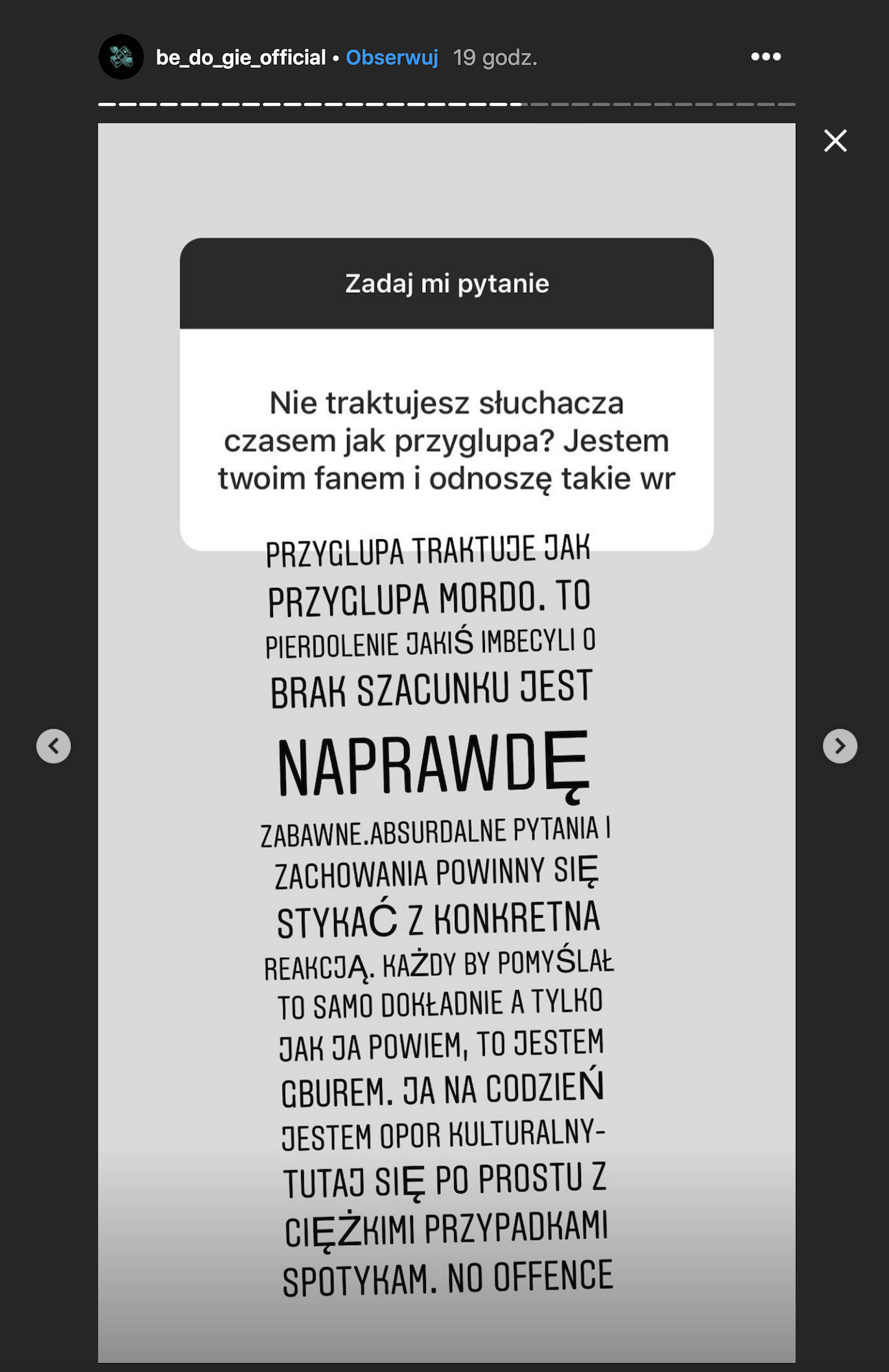 – Przygłupa traktuje jak przygłupa mordo. To pierdolenie jakiś imbecyli o brak szacunku jest naprawdę zabawne. Absurdalne pytania i zachowania powinny się stykać z konkretną reakcją. Każdy by pomyślał to samo dokładnie, a tylko jak ja powie, to jestem gburem. Ja na co dzień jestem opór kulturalny – tutaj się po prostu z ciężkimi przypadkami spotykam. No offece.