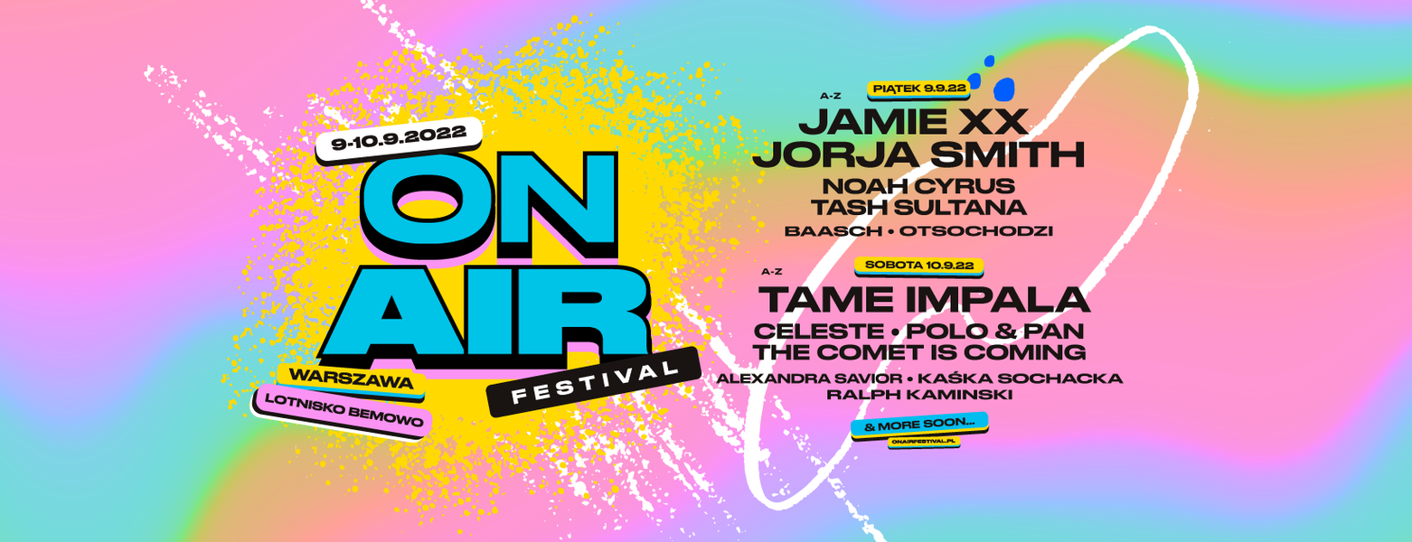 ON AIR to mieszanka klimatu londyńskiego Lovebox i legendarnej Lollapaloozy przeniesiona do tętniącej życiem Warszawy. Ideą festiwalu jest łączenie różnych gatunków muzycznych – od indie rockowych szlagierów, przez pop i hip-hop po muzykę eksperymentalną. W miasteczku festiwalowym nie zabraknie także stref chilloutu, barów z orzeźwiającymi drinkami, foodtrucków z pysznym jedzeniem oraz mnóstwa innych atrakcji, których szczegóły poznamy już wkrótce.